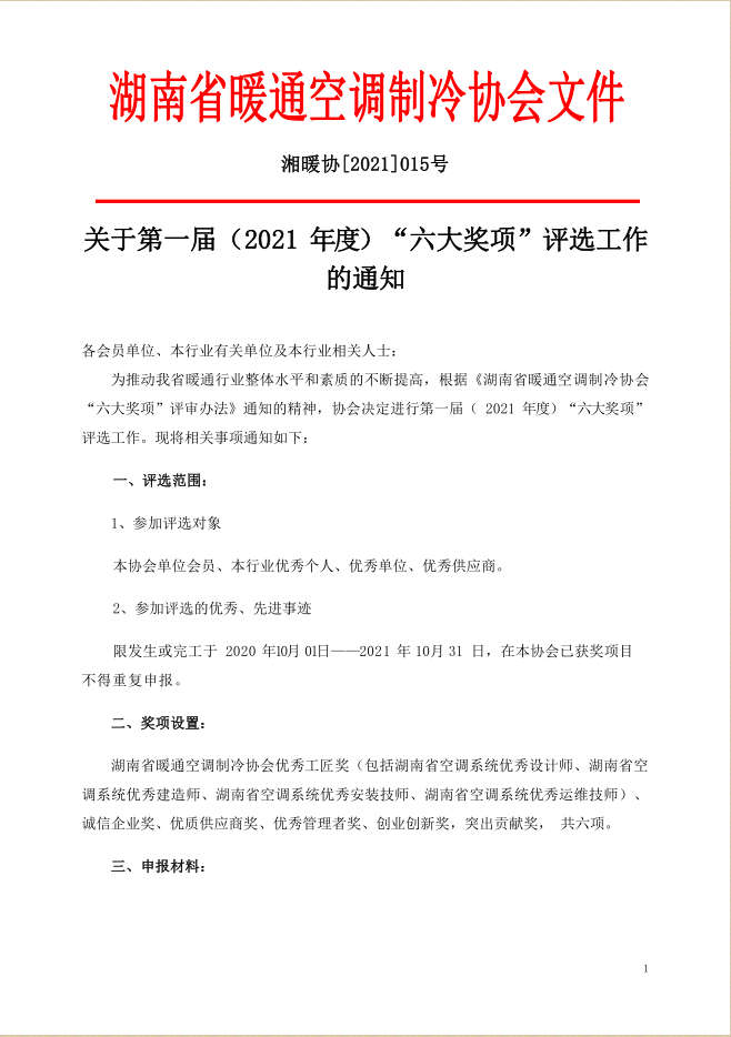 为了推动我省暖通行业整体水平的不断提高,根据《湖南省暖通工程质量荣誉奖暨“暖通神农奖”评审办法》和《湖南省暖通空调制冷协会“六大奖项”评审办法》通知的精神,协会决定进行第一届(2021 年度)优质工程“暖通神农奖” 及 第一届(2021 年度)“六大奖项”评选工作。现将相关事项通知如下: