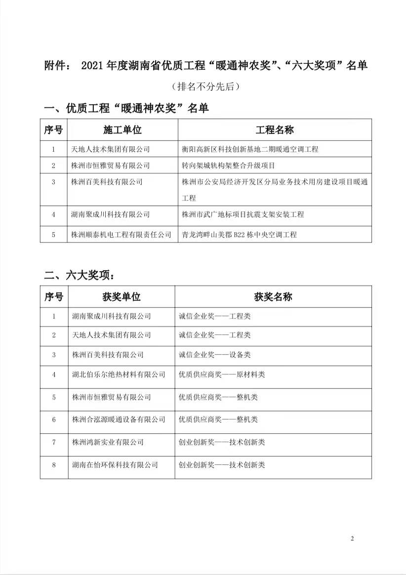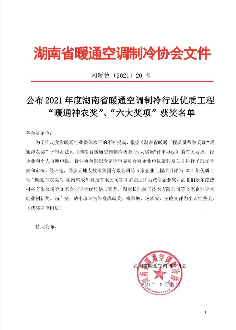 2021年度湖南省暖通空调制冷行业优质工程“暖通神农奖”、“六大奖项”获奖名单