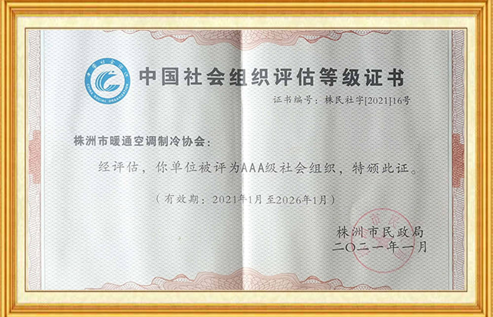 热烈祝贺株洲市暖通空调制冷协会获得株洲市社会组织评估等级“3A”荣誉
